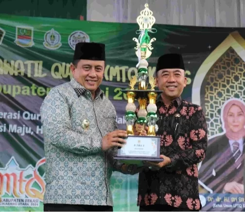 Kabupaten Bekasi,potretpublik.co.id – Penjabat (Pj) Bupati Bekasi Dedy Supriyadi menyerahkan piala bergilir Musabaqah Tilawatil Qur’an (MTQ) ke-56 Tingkat Kabupaten Bekasi tahun 2024 kepada Kafilah Kecamatan Cikarang Utara yang berhasil keluar sebagai Juara Umum.