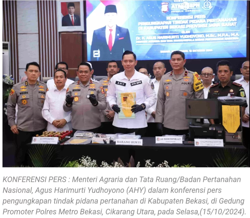 “Kasus pemalsuan dokumen sertifikat tanah ini memang masih kerap terjadi di berbagai daerah dan tadi sudah ada target operasi dengan kasus dokumen yang dipalsukan. Stempelnya juga dipalsukan seolah-olah asli, mirip sekali dengan yang asli padahal palsu,” ucap AHY dalam konferensi pers pengungkapan tindak pidana pertanahan di Polres Metro Bekasi, Cikarang Utara, Selasa (15/10/2024).