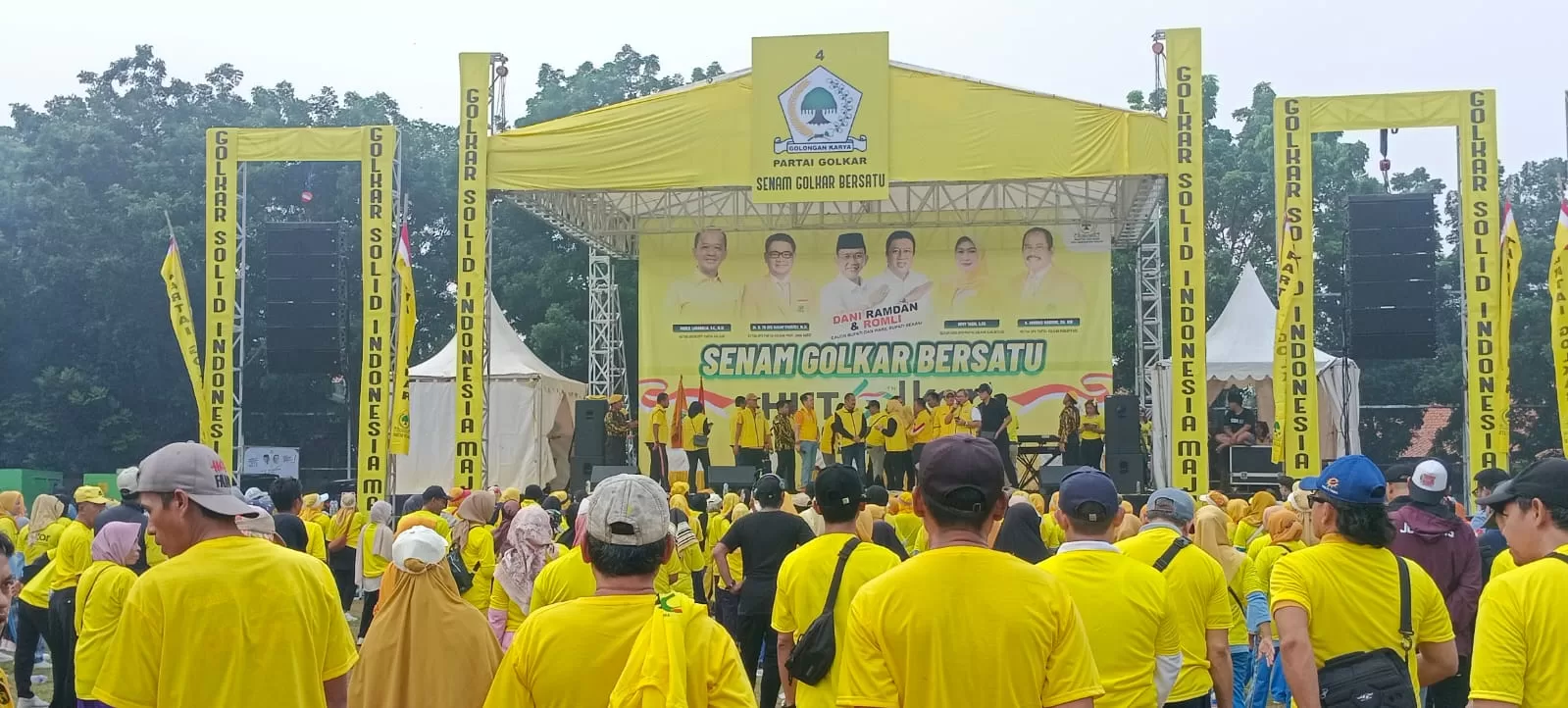 Bertempat di lapangan sepak bola telaga asih kecamatan cikarang barat kabupaten bekasi, ribuan warga dengan menggunakan kaos berwarna kuning berkumpul, untuk mengikuti kegiatan senam bersama dalam rangka perayaan hari jadi partai golkar yang ke 60 tahun.