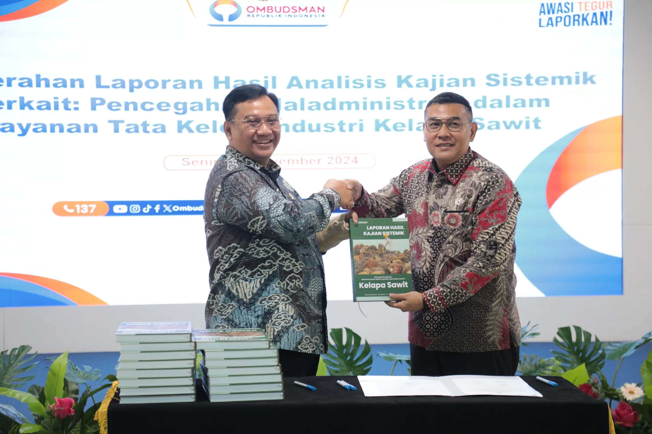 Jakarta, Potretpublik.co.id – Menteri Agraria dan Tata Ruang/Kepala Badan Pertanahan Nasional (ATR/BPN) yang dalam hal ini diwakili Ossy Dermawan selaku Wakil Menteri (Wamen) ATR/Wakil Kepala (Waka) BPN menerima Laporan Hasil Kajian Sistemik tentang Pencegahan Maladministrasi dalam Layanan Tata Kelola Industri Kelapa Sawit dari Ombudsman Republik Indonesia (ORI), Senin (18/11/2024).