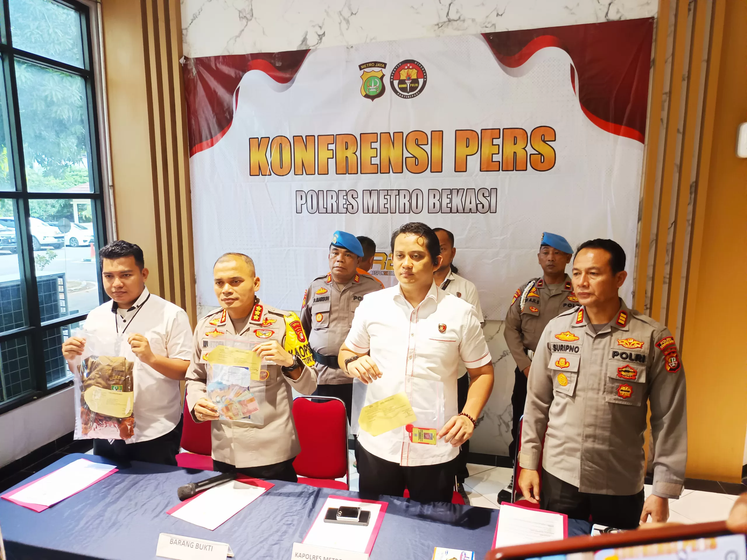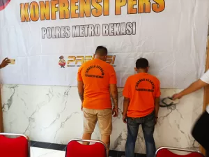 Kapolres Metro Bekasi Kombes Pol Mustofa dalam keterangan Persnya menjelaskan, pada Senin, 24/03/2025 sekitar pukul 02.00 WIB, Unit 3 Jatanras Sat Reskrim Polres Metro Bekasi Bersama Unit Reskrim Polsek Cikarang Barat telah mengamankan 2 (dua) orang pelaku pemerasan dengan dalih THR di Pasar Induk Cibitung yaitu Sodri dan Samsul dengan ancaman kekerasan sebagaimana dimaksud dalam pasal 368 KUHP.