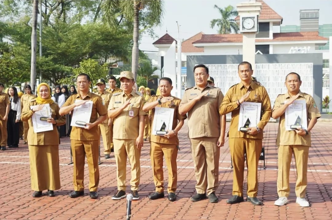 Karawang || Potretpublik – Bupati Karawang H. Aep Syaepuloh memimpin apel pagi di lingkungan kantor bupati sekaligus memberikan piagam penghargaan Lomba Desa tingkat Kabupaten (Anugerah Gapura Sri Baduga) yang dilaksanakan di Plaza Pemda, Senin (6/10/25).