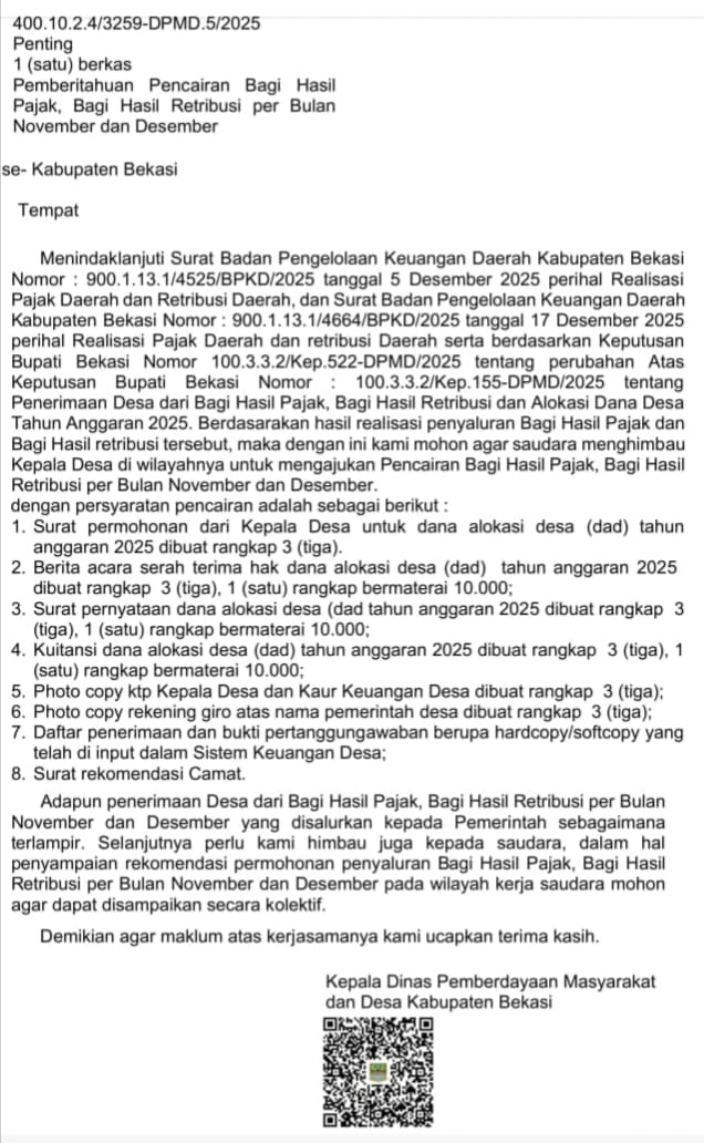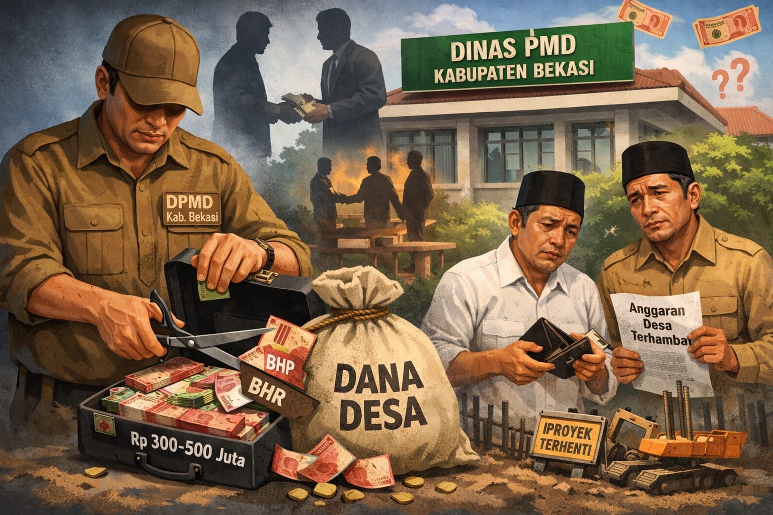 Kabupaten Bekasi || Potretpublik – Dugaan pemotongan anggaran Bagi Hasil Pajak (BHP) dan Bagi Hasil Retribusi (BHR) yang menjadi hak desa di Kabupaten Bekasi semakin menemukan titik terang. Sebuah surat resmi Dinas Pemberdayaan Masyarakat dan Desa (DPMD) Kabupaten Bekasi bernomor 400.10.2.4/3259-DPMD.5/2025 kini menjadi sorotan dan diduga sebagai pintu masuk praktik pemangkasan anggaran desa secara administratif.