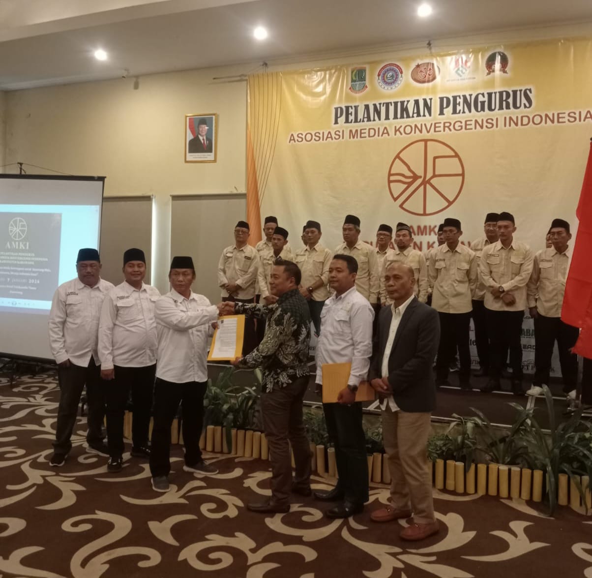 Keterangan Foto : Asosiasi Media Konvergensi Indonesia (AMKI) Kabupaten Karawang resmi dilantik Endang Suryana menjabat sebagai ketua periode 2026 - 2029 bertempat di Hotel Akshaya, Telukjambe Timur, Karawang, Rabu (7/1/2026).