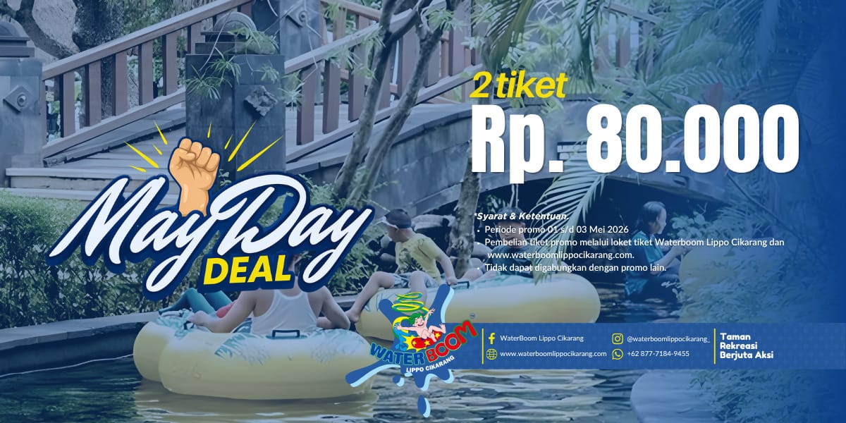 Promo May Day Deal berlaku untuk periode pembelian 1 – 3 Mei 2026, dan tiket dapat dibeli melalui website resmi Waterboom Lippo Cikarang maupun langsung di lokasi. Dengan berbagai wahana air yang menyenangkan serta suasana rekreasi yang nyaman dan aman, Waterboom Lippo Cikarang terus berkomitmen menghadirkan pengalaman liburan yang berkualitas bagi seluruh pengunjung.